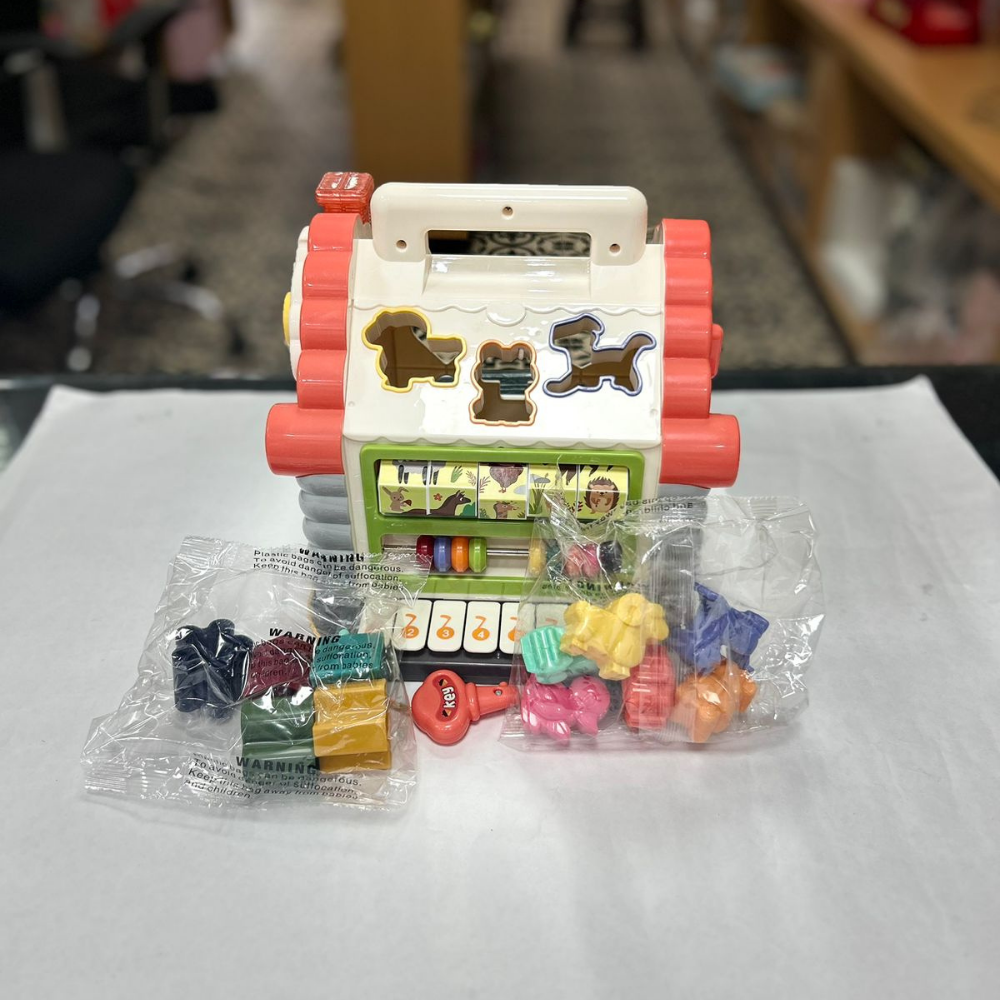 • Includes animal shaped cubes that can be inserted into the corresponding animal holes in the house, and the animals will make a sound