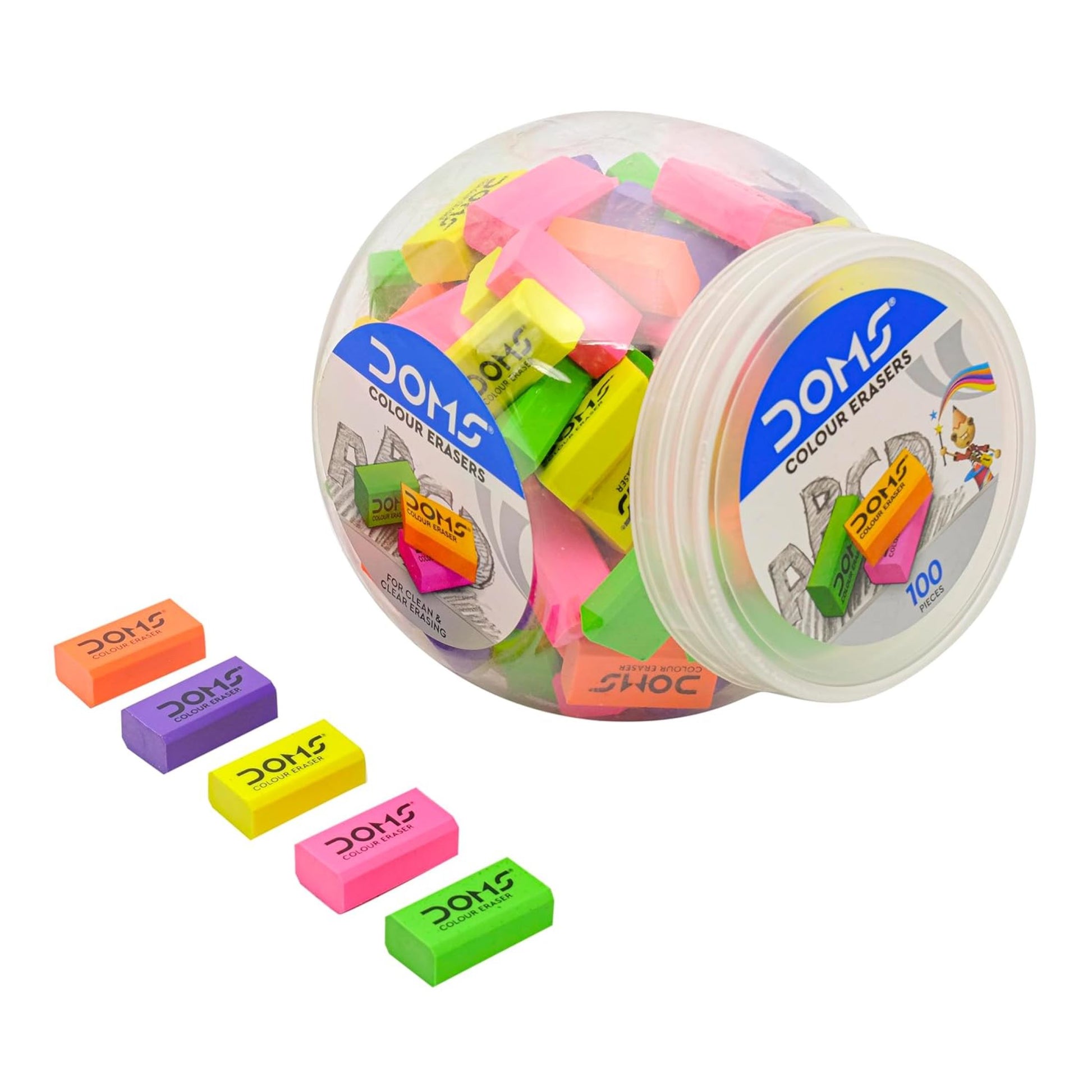 Make erasing neat and easy with the Doms Color Erasers Jar Pack — designed to deliver clean, clear, and dust-free erasing for everyday school and office use. These erasers remove pencil marks smoothly without smudging or tearing the paper, keeping notebooks and assignments neat and tidy.